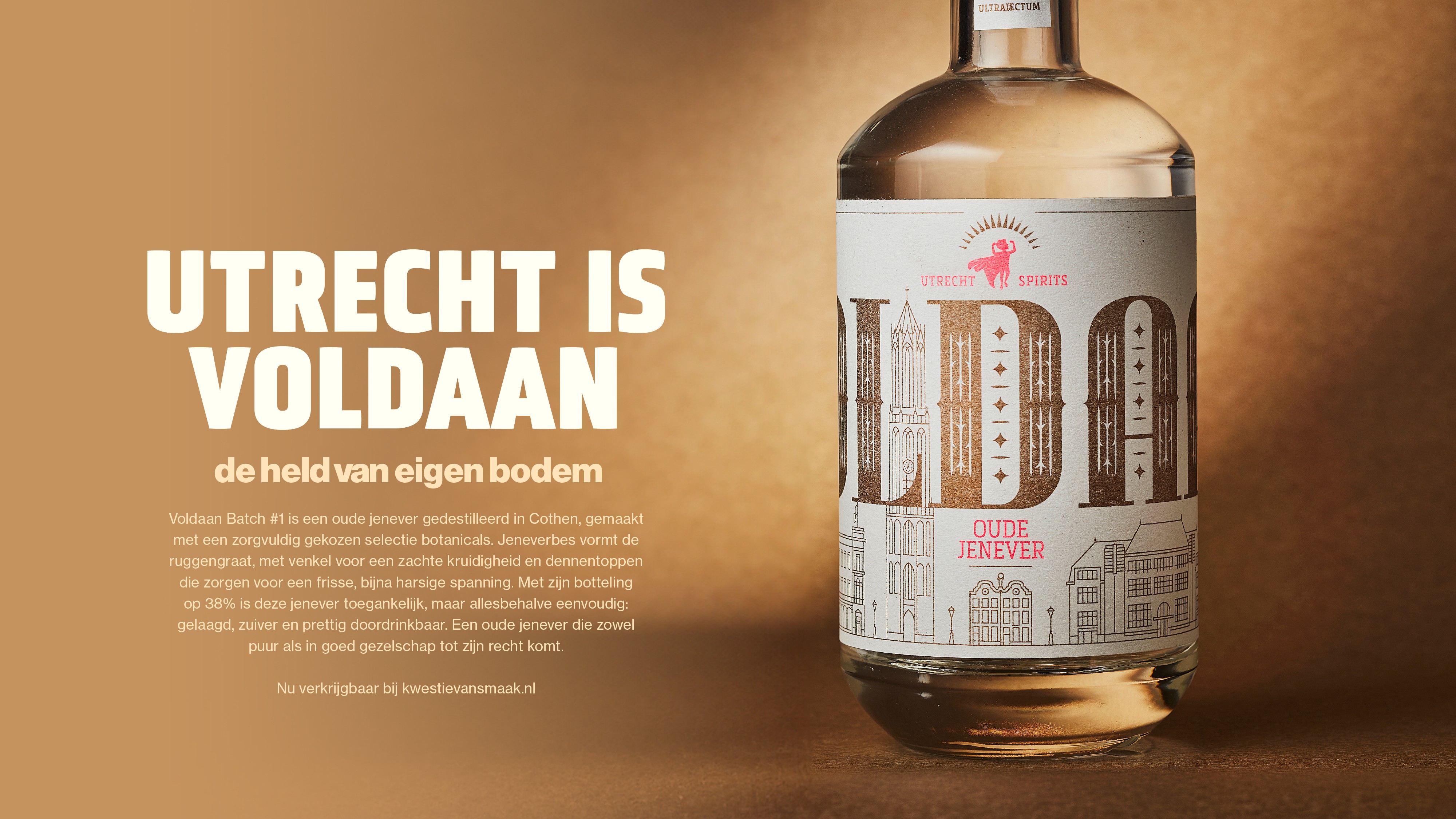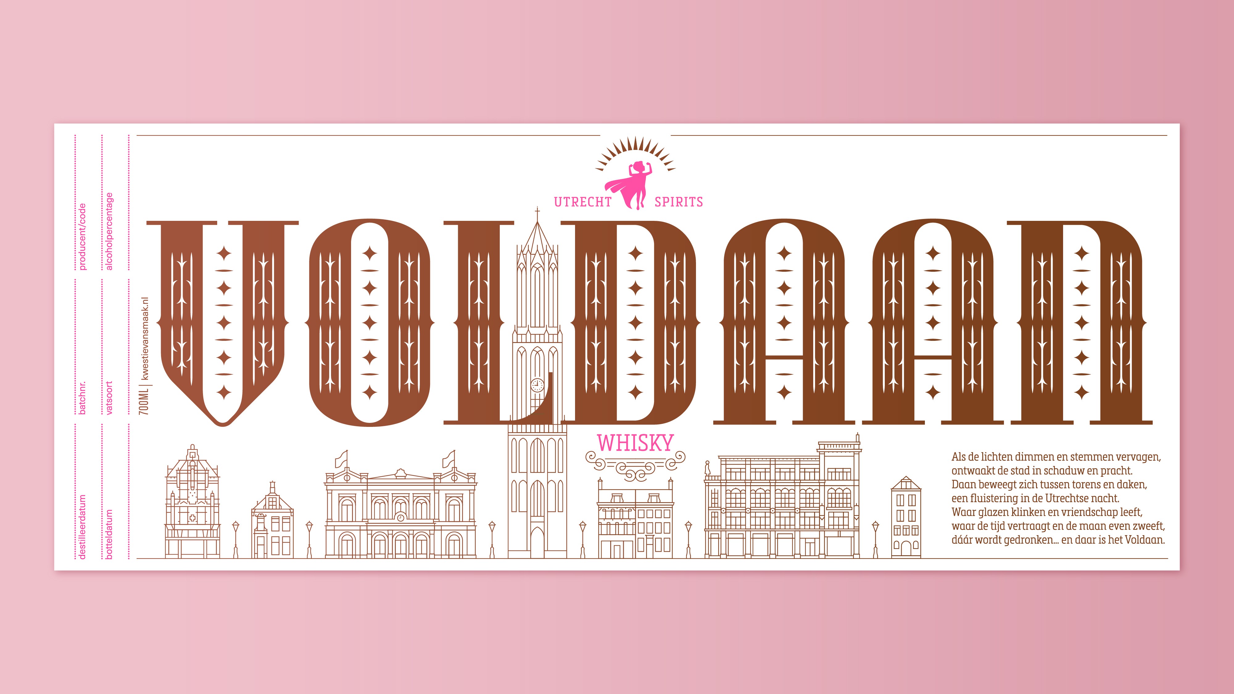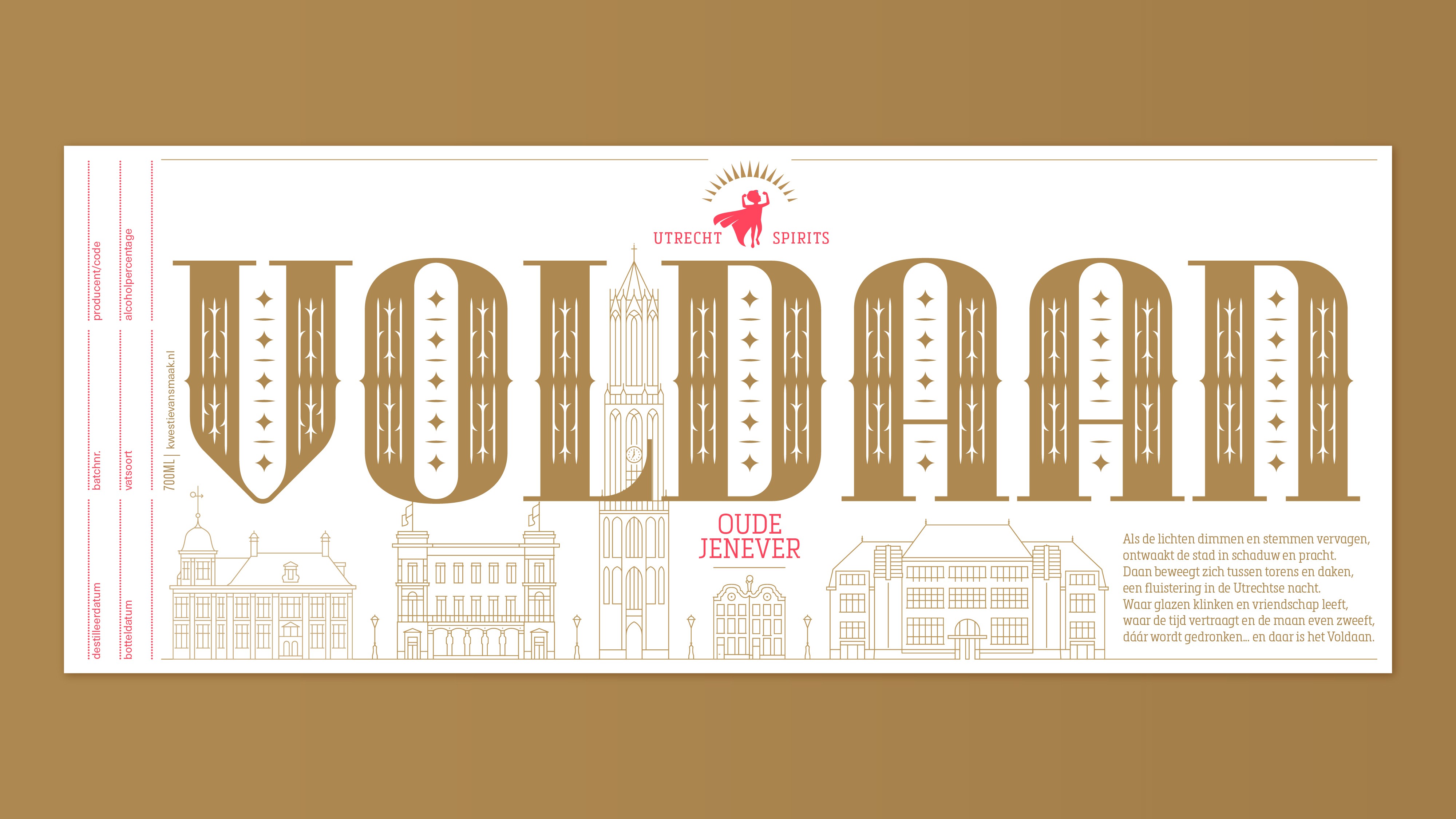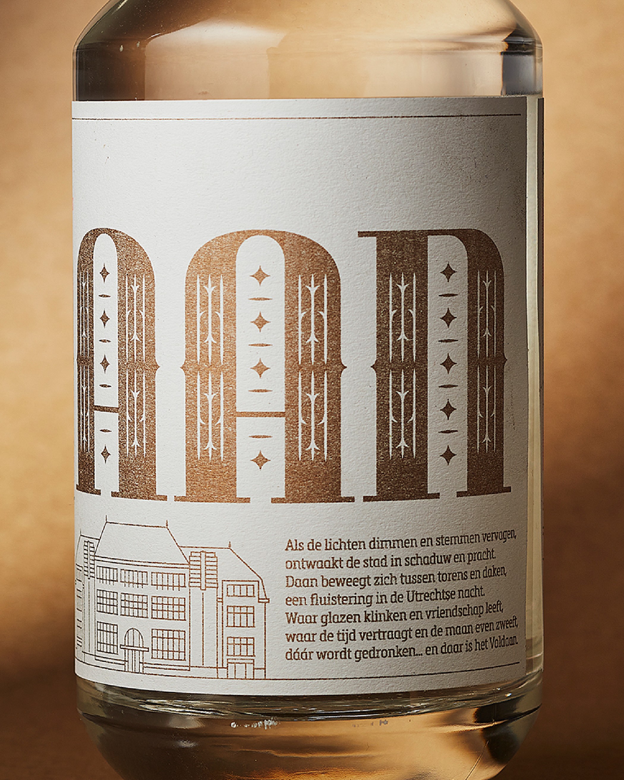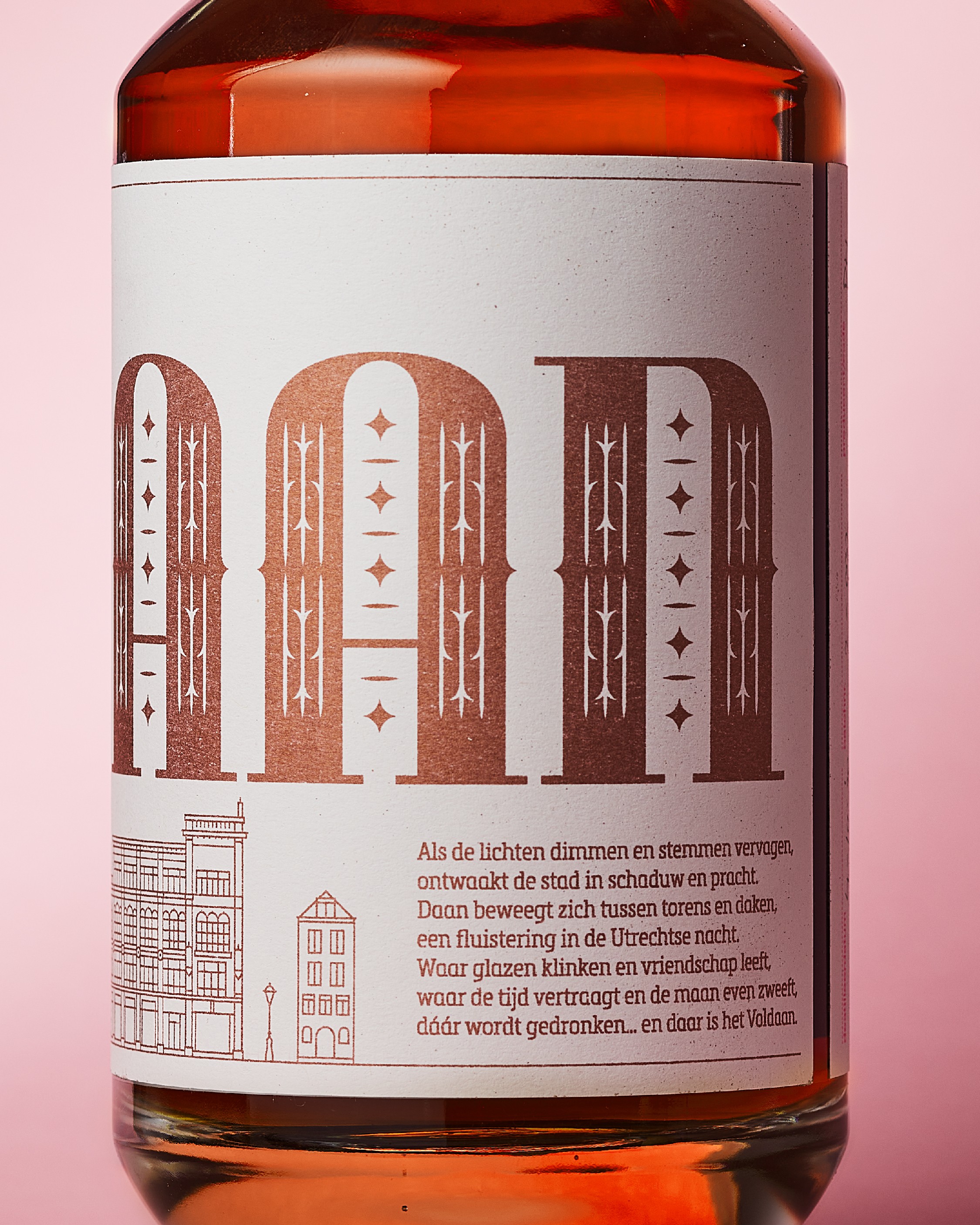De merknaam 'Voldaan' plaatsten we groot rondom de fles en dwingt je zo de fles 360 graden te bekijken. Onder de naam staat een lijnillustratie van de Utrechtse skyline, opgebouwd uit herkenbare gebouwen die per variant verschillen. Daan kreeg een centrale plek boven de D.