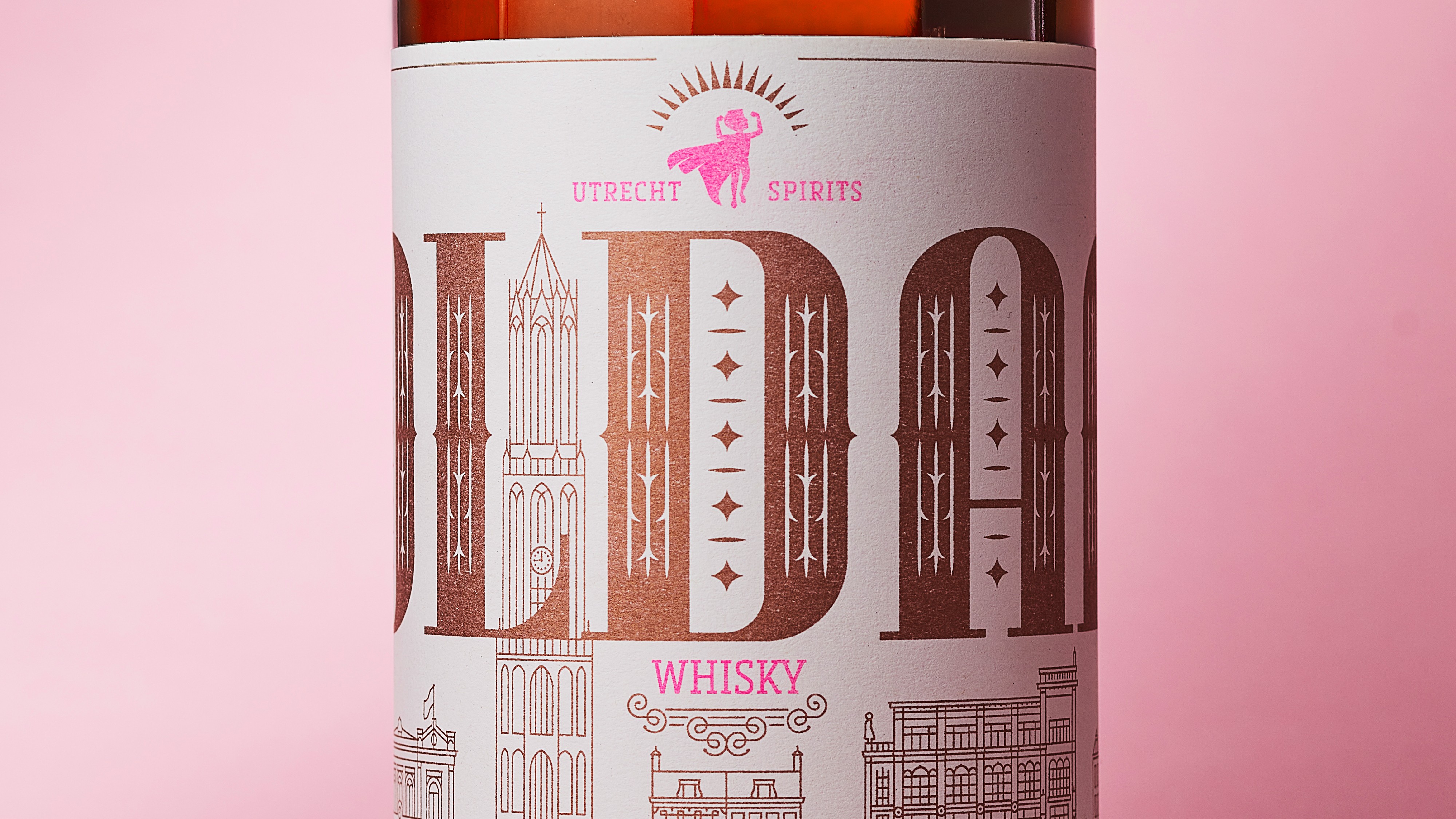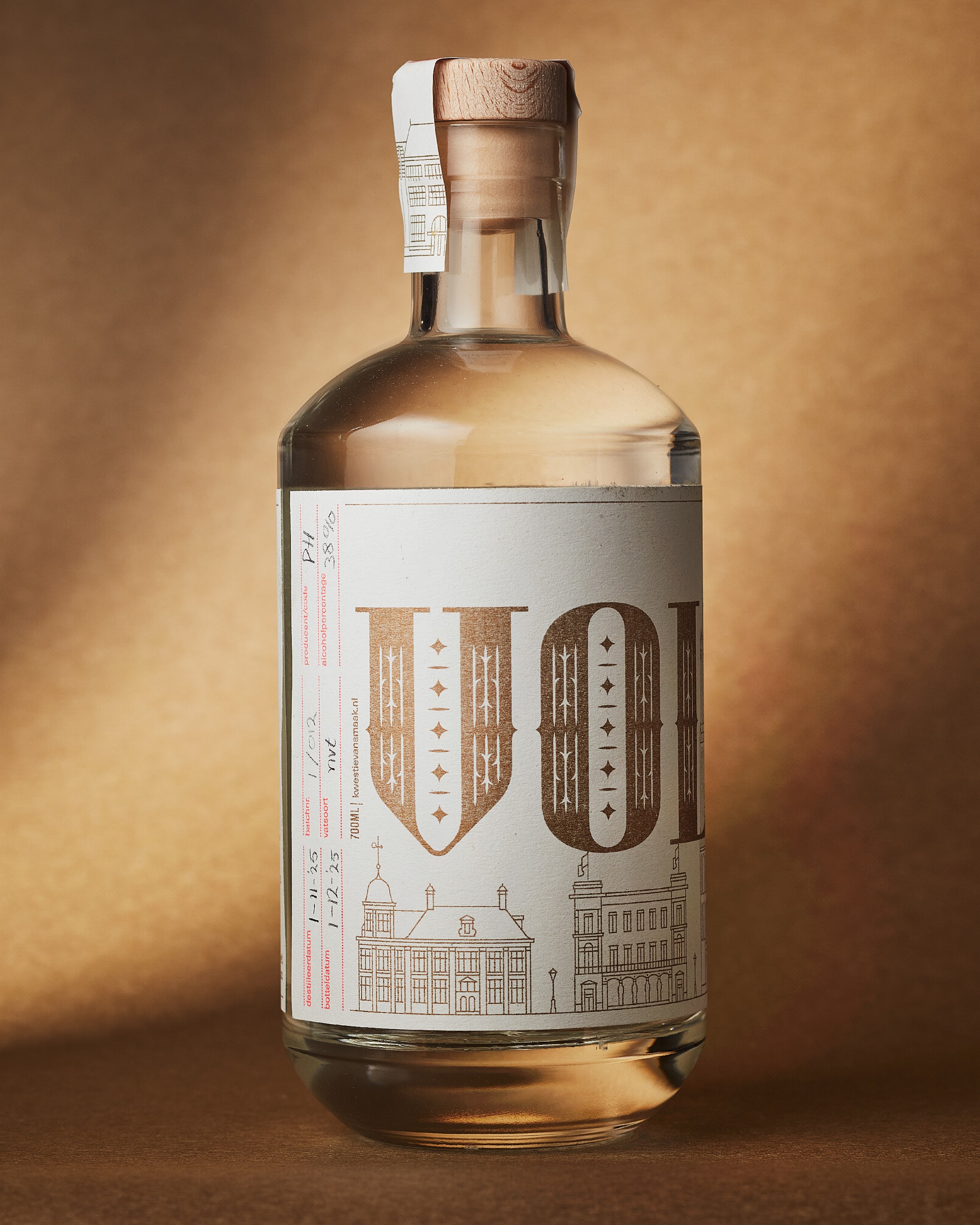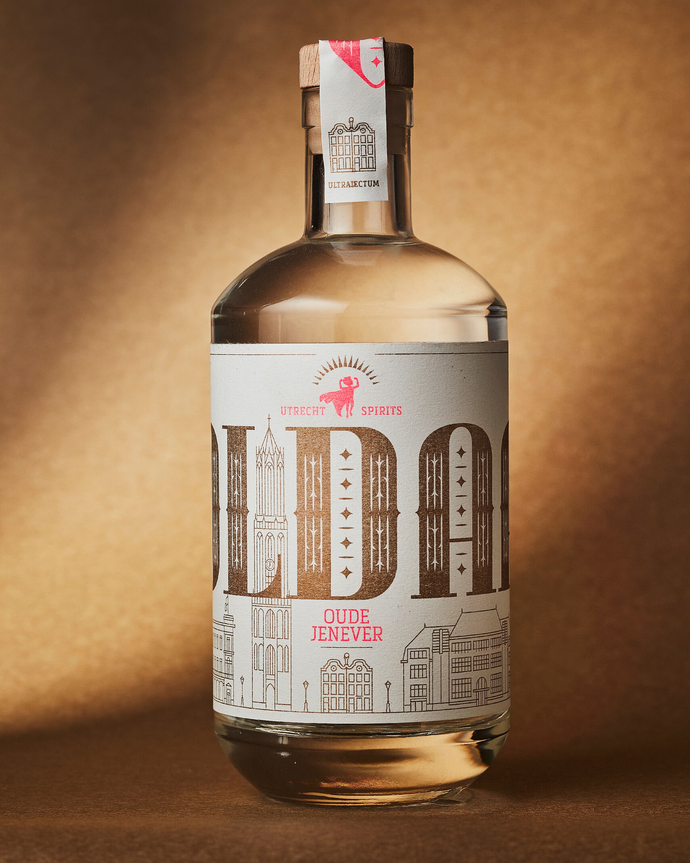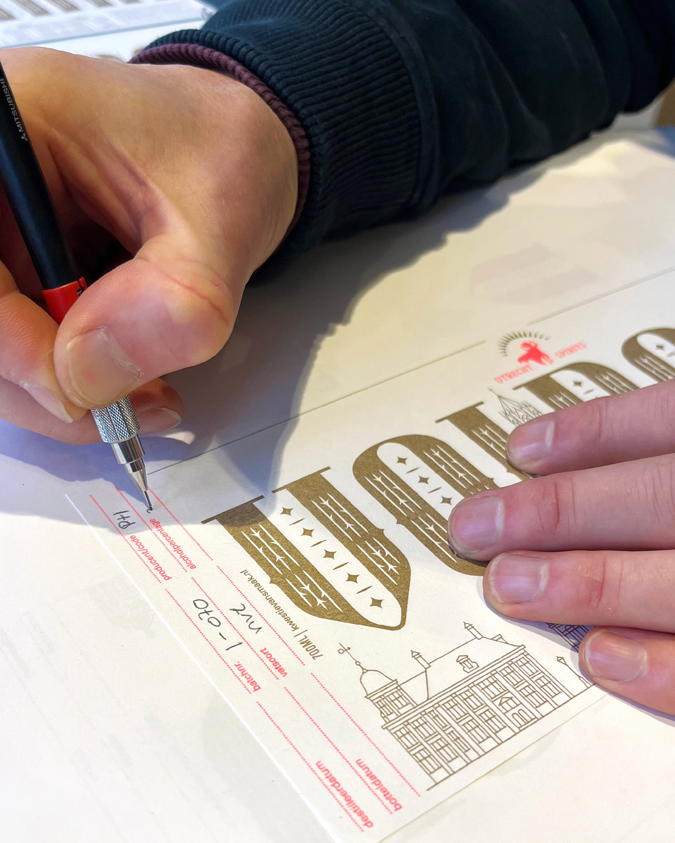 Alle elementen zijn speciaal voor dit project door ons ontworpen: van de typografie tot de illustraties. Door de mix van metallic en fluorescerende inkten ontstaat een mooi spanningsveld tussen klassiek en modern. De zegel over de dop, met een prominente V en de Latijnse naam voor Utrecht (Ultraiectum), maakt het verhaal rond.