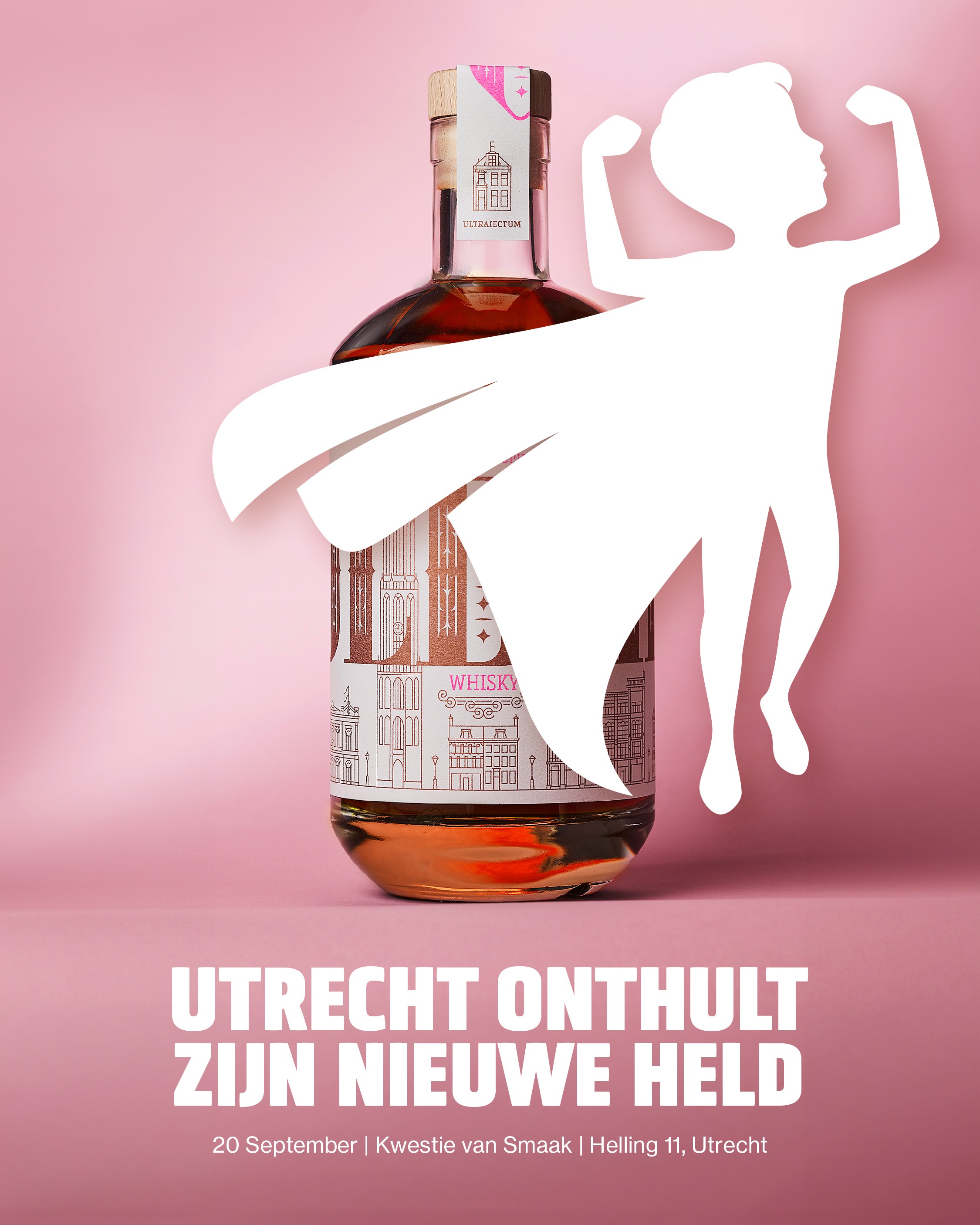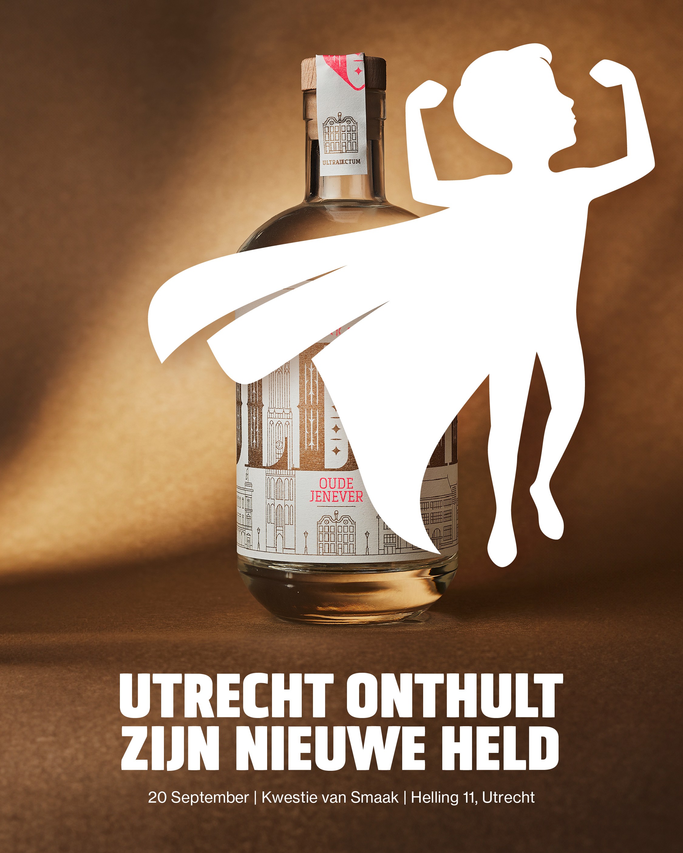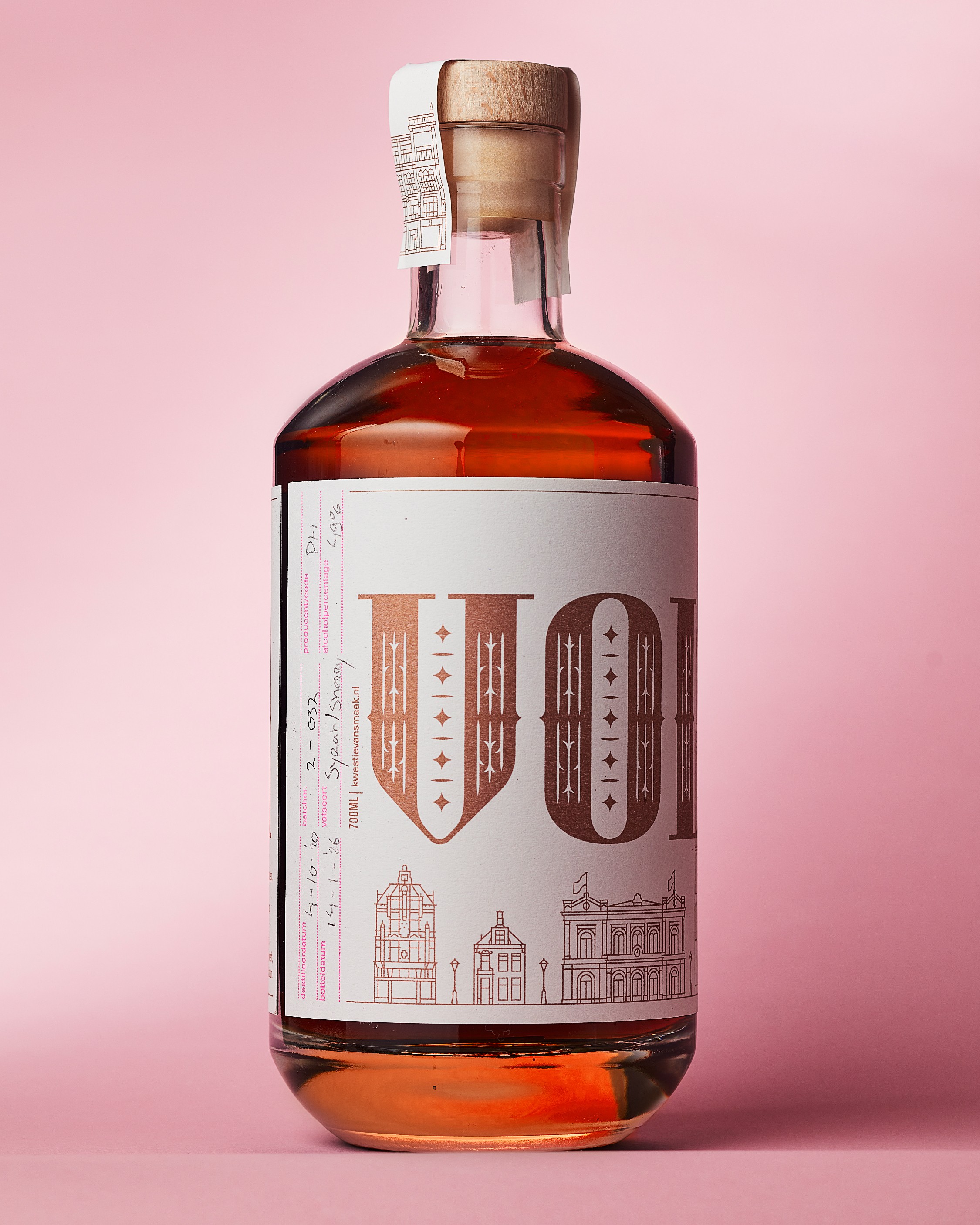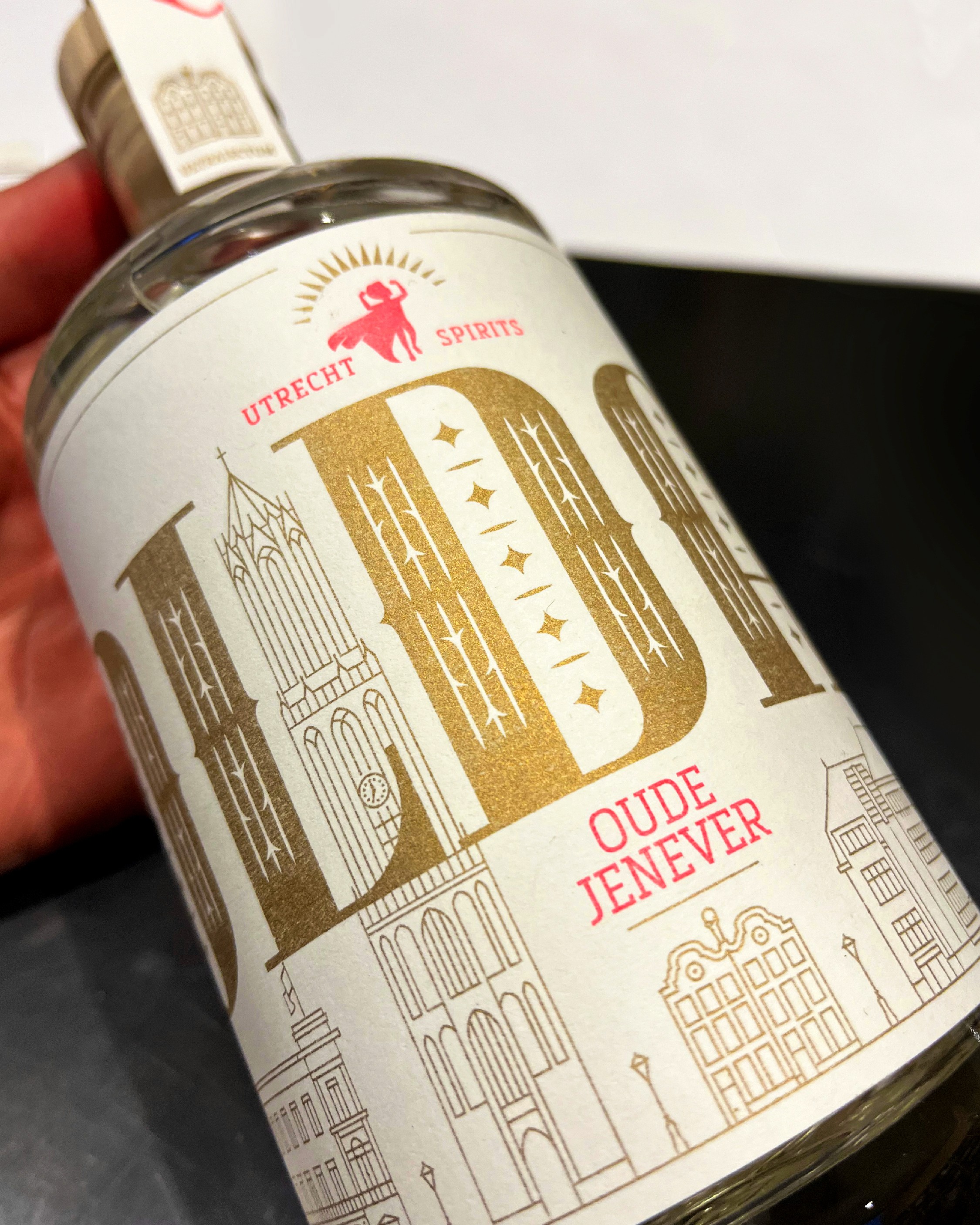 Alle elementen zijn speciaal voor dit project door ons ontworpen: van de typografie tot de illustraties. Door de mix van metallic en fluorescerende inkten ontstaat een mooi spanningsveld tussen klassiek en modern. De zegel over de dop, met een prominente V en de Latijnse naam voor Utrecht (Ultraiectum), maakt het verhaal rond.